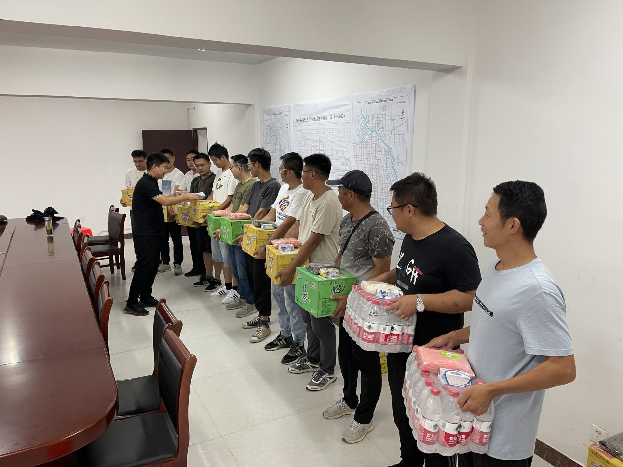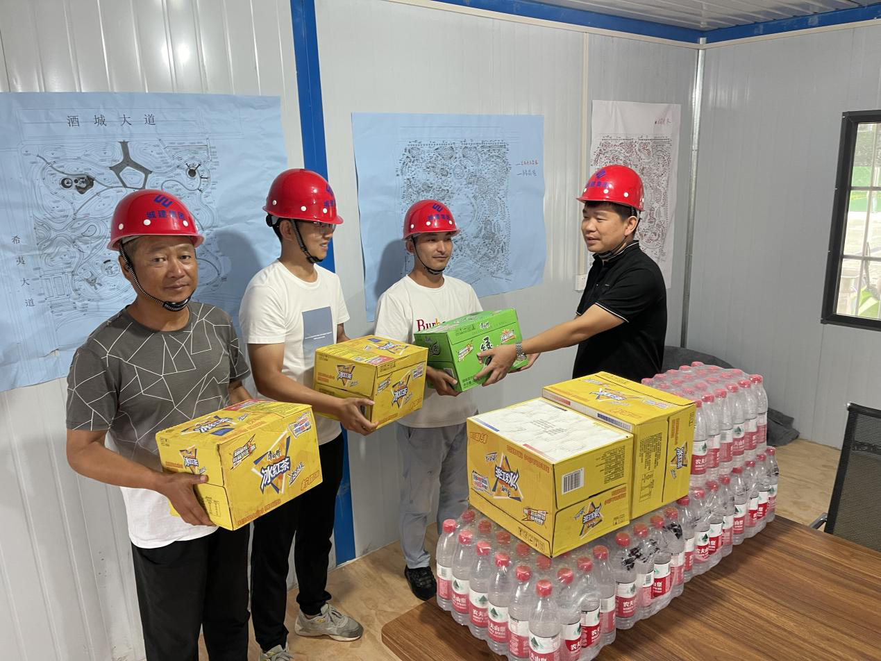 大力推進(jìn)工程進(jìn)度的同時(shí)楊總交代大家,現(xiàn)階段亳州降雨量不大,氣溫更是從五月份開始就居高不下,現(xiàn)場(chǎng)作業(yè)難度陡升,我們要克服萬難,不怕艱辛,在不落工程進(jìn)度的同時(shí)一定也要保障施工人員的安全。除了依照上級(jí)領(lǐng)導(dǎo)要求的佩戴質(zhì)量好的安全頭盔和買好人身保險(xiǎn)以外,更應(yīng)該考慮到酷熱天氣給基層人員帶來的不便及危險(xiǎn),楊總在傳達(dá)了集團(tuán)領(lǐng)導(dǎo)的指示精神后,冒著來之不易的大雨,帶著清涼飲品先后去往養(yǎng)護(hù)、亳蕪公園以及醫(yī)療器械產(chǎn)業(yè)園等項(xiàng)目,親自為各個(gè)項(xiàng)目送去一箱箱茶水飲料,將集團(tuán)的關(guān)懷送到施工現(xiàn)場(chǎng),送到基層工作人員的身邊。