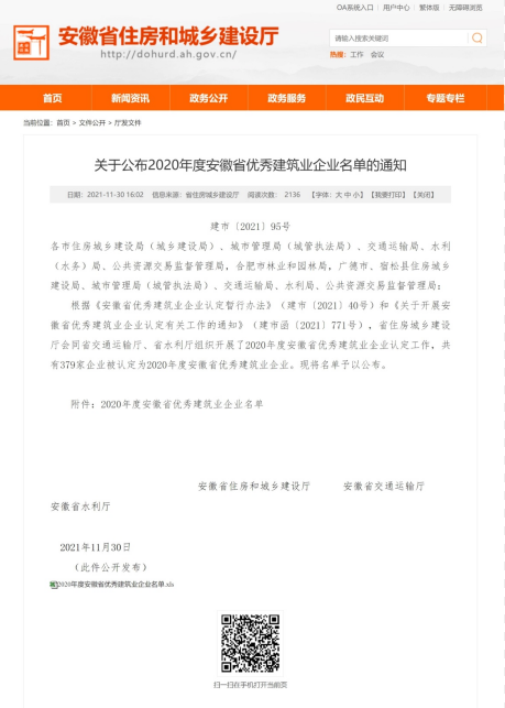 近日,安徽省住房城鄉(xiāng)建設(shè)廳公布2020年度安徽省優(yōu)秀建筑業(yè)企業(yè)名單,城建集團光榮上榜,榮獲“2020年度安徽省優(yōu)秀建筑業(yè)企業(yè)”榮譽稱號。