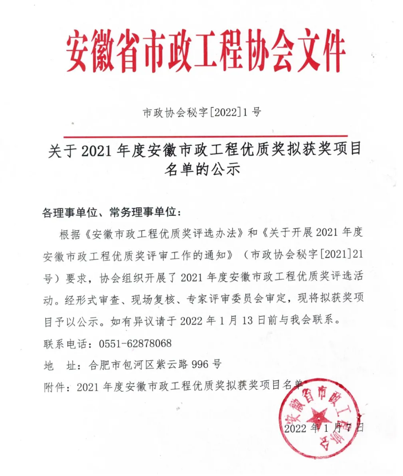 “安徽省市政工程優(yōu)質(zhì)獎(jiǎng)”是安徽省市政工程質(zhì)量的最高榮譽(yù)獎(jiǎng)項(xiàng),是對市政工程技術(shù)及工藝水平先進(jìn)性和可行性最好的體現(xiàn)。2022年集團(tuán)將繼續(xù)提高管理水平、提升質(zhì)量標(biāo)準(zhǔn),向社會提供質(zhì)量可靠、群眾滿意的精品工程。