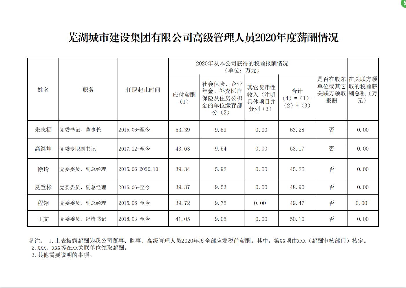 蕪湖城市建設(shè)集團(tuán)有限公司高級(jí)管理人員2020年度薪酬情況