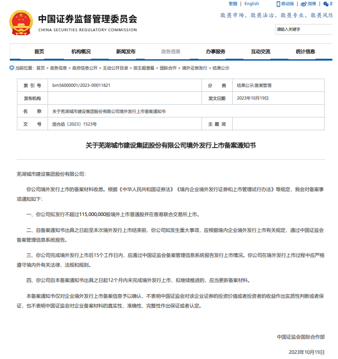 蕪湖城市建設(shè)集團(tuán)股份有限公司(以下簡稱“蕪湖城建”或“公司”)于2023年10月收到中國證監(jiān)會國際合作部《關(guān)于蕪湖城市建設(shè)集團(tuán)股份有限公司境外發(fā)行上市備案通知書》,同意公司擬發(fā)行境外上市普通股并在香港聯(lián)合交易所上市,具體內(nèi)容如下: