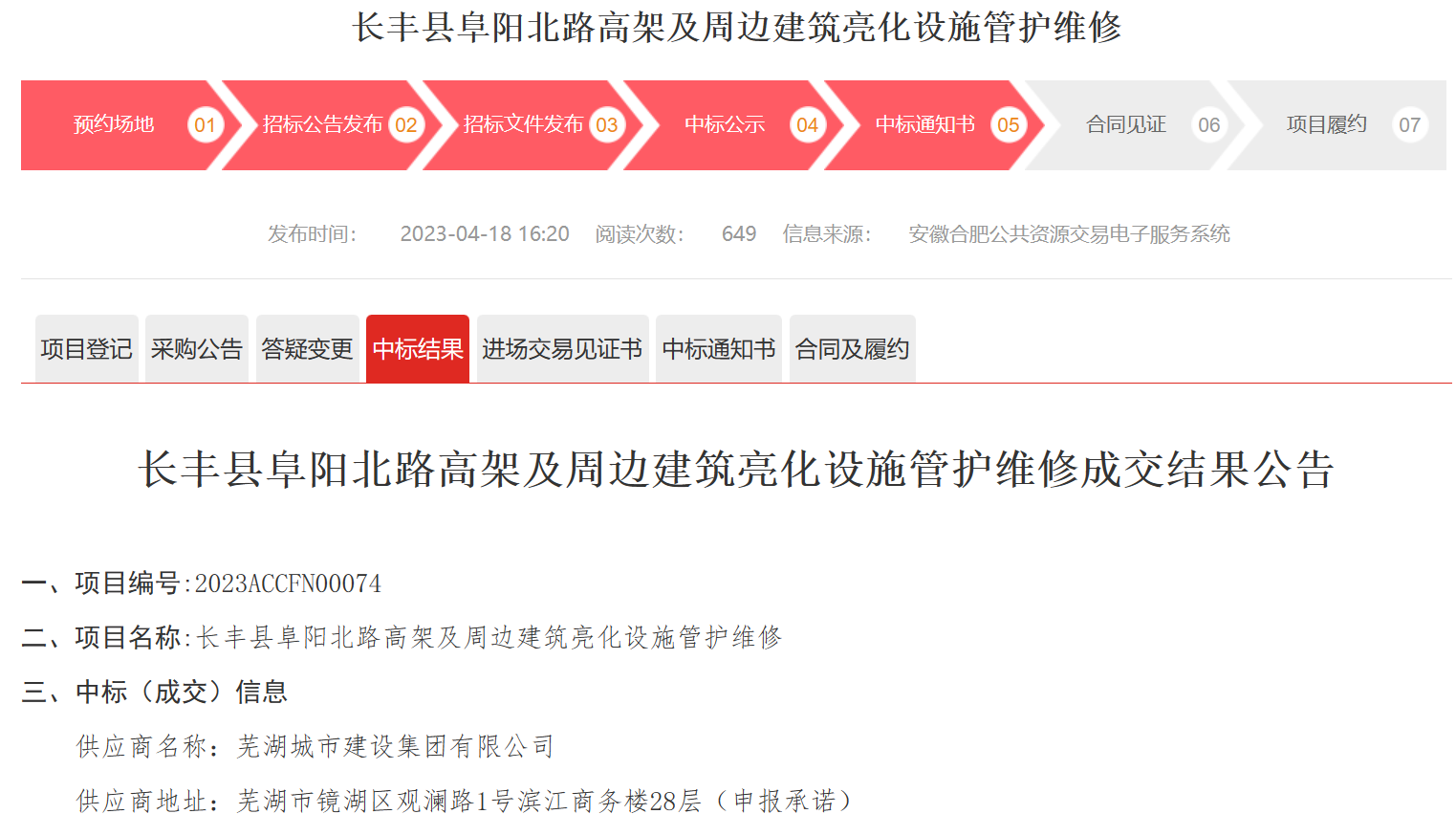 長豐縣阜陽北路高架及周邊建筑亮化設(shè)施管護維修,該項目服務(wù)期限為 1 年。合同履約完成后,經(jīng)采購方考核合格,在年度預(yù)算能夠保障的前提下,經(jīng)雙方協(xié)商同意后,可續(xù)簽 2 年合同,合同一年一簽。項目主要內(nèi)容是對阜陽北路高架及周邊建筑的亮化燈具、配電設(shè)備、配套控制器等相關(guān)設(shè)施維修及管護。