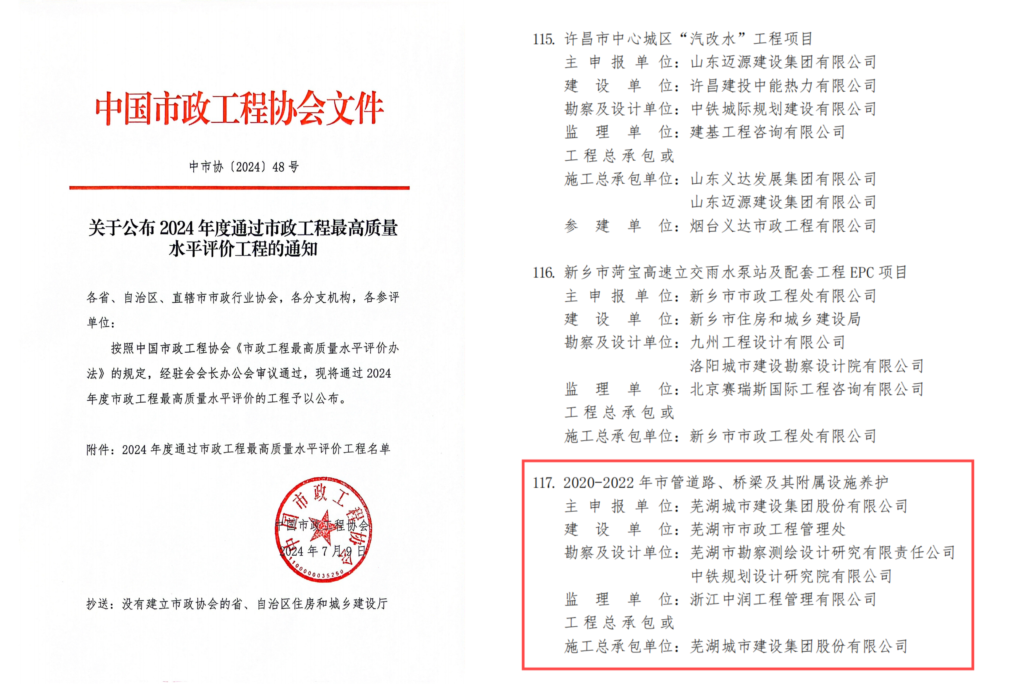 砥礪前行 再創(chuàng)輝煌|蕪湖城建榮獲2024年市政工程最高質(zhì)量水平評(píng)價(jià)!