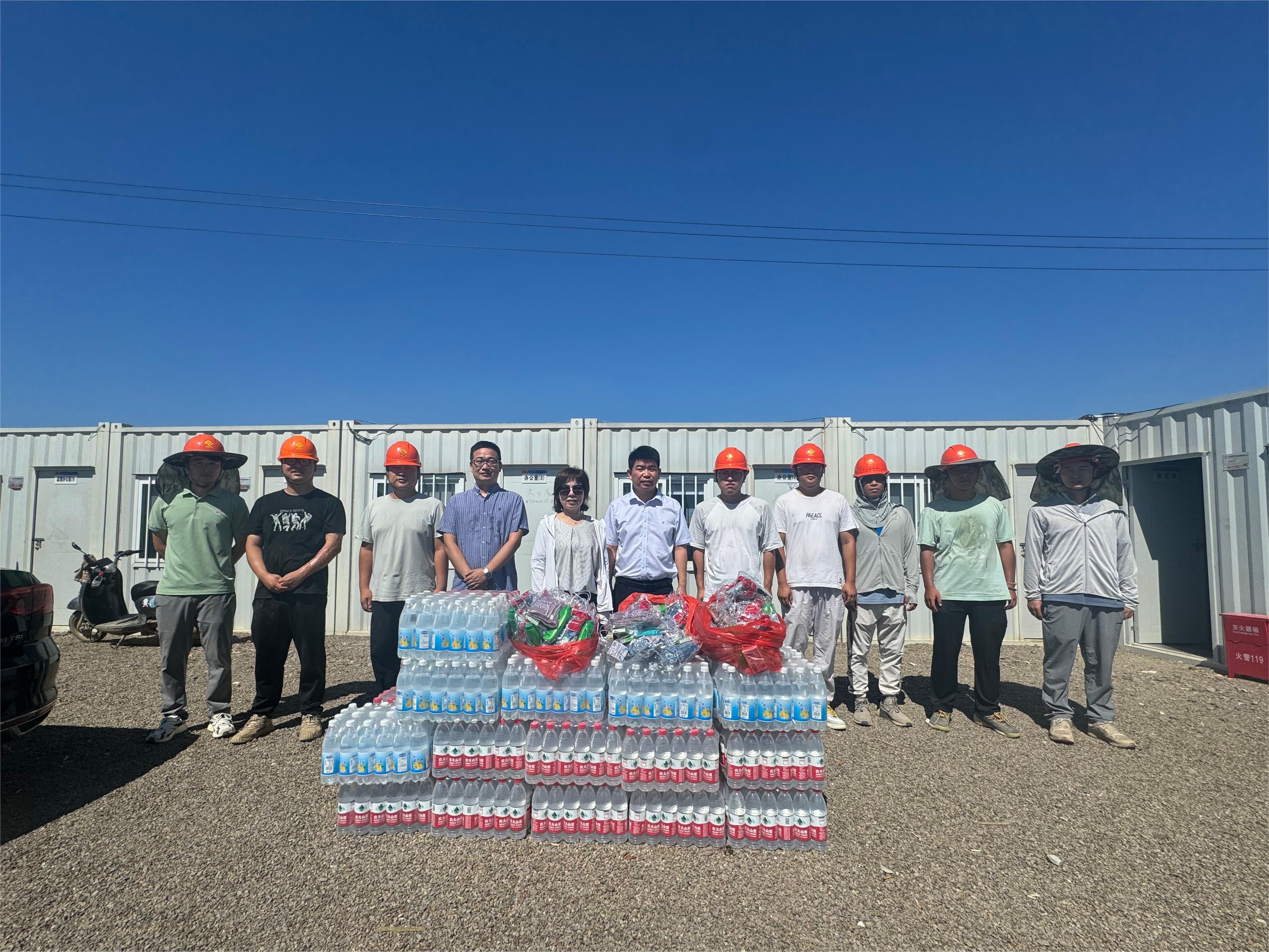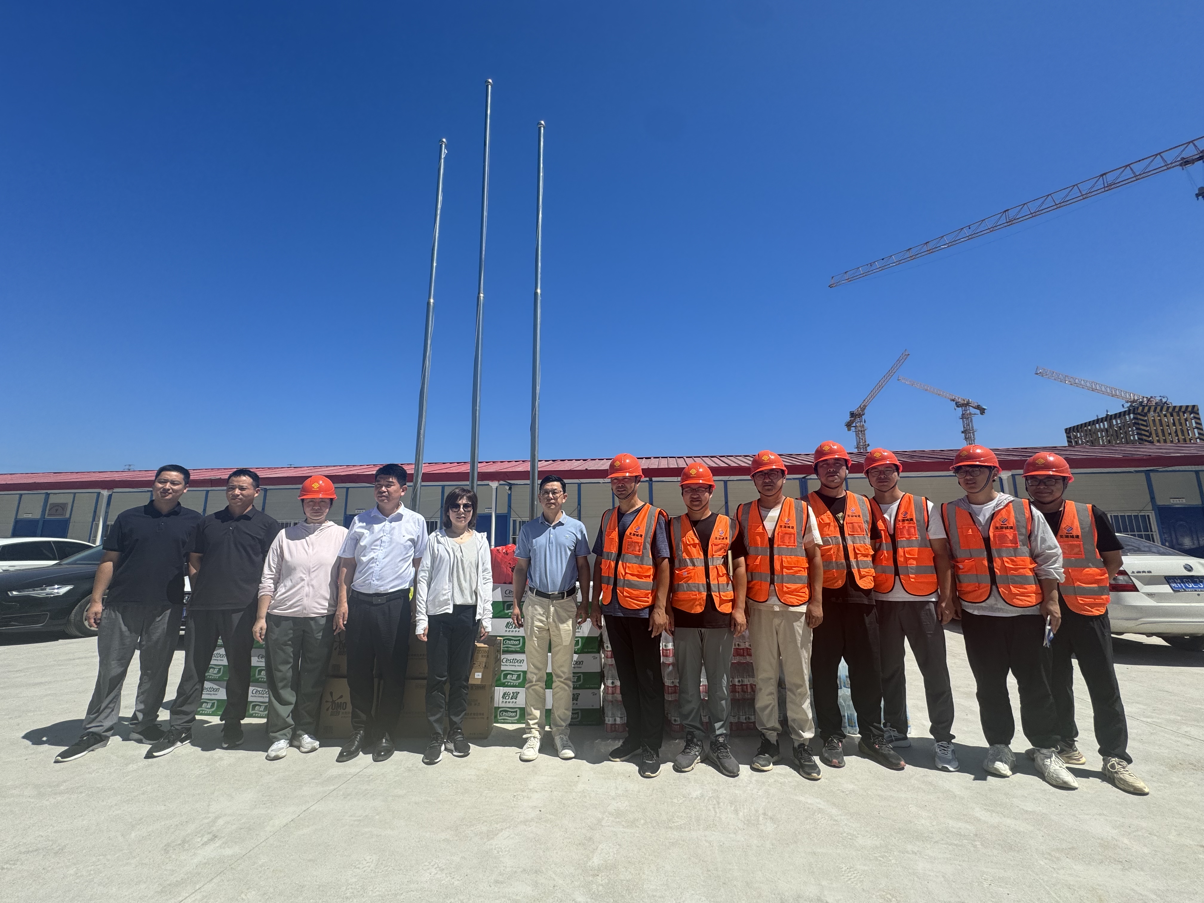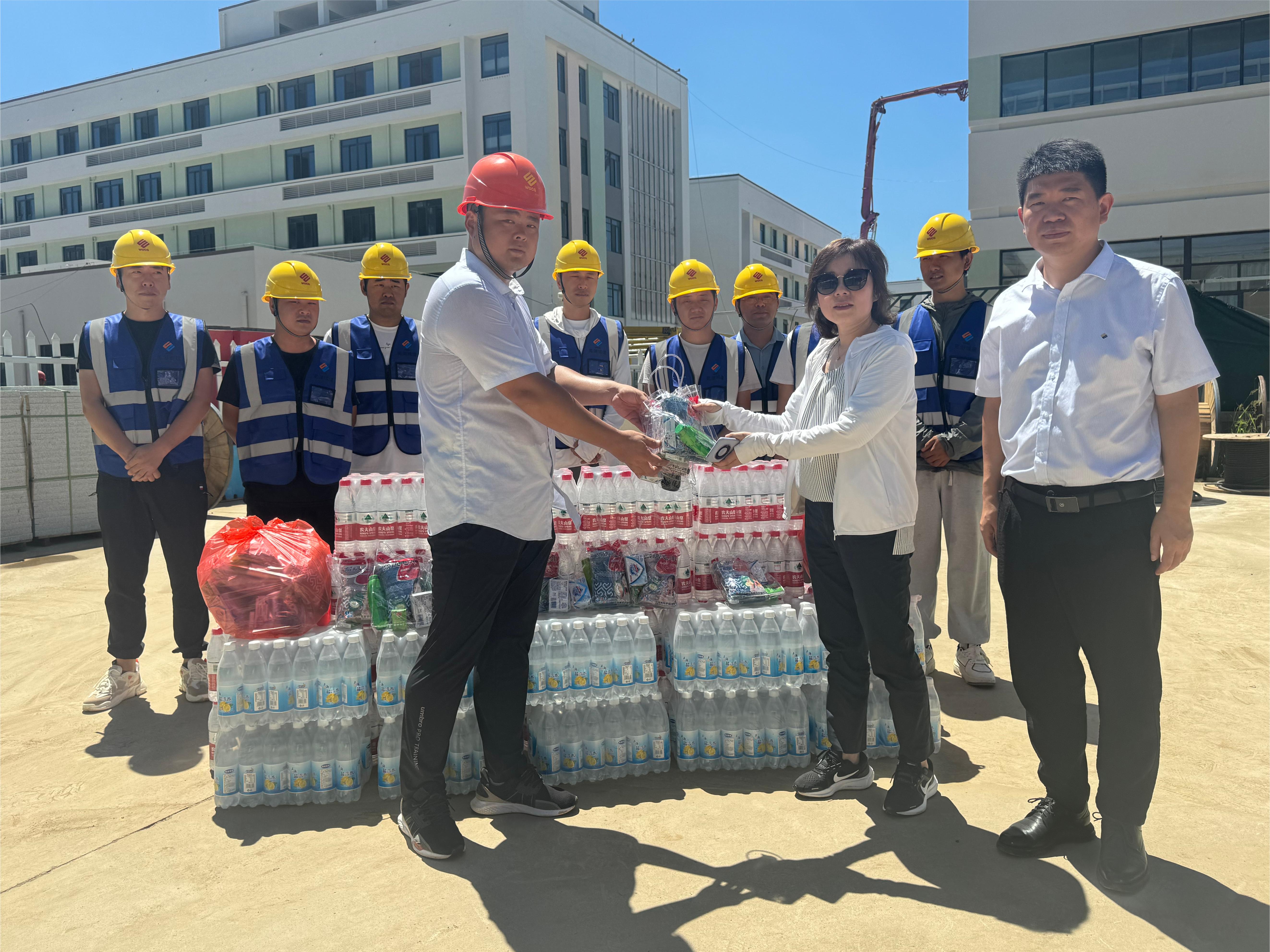 朱志福一行對現(xiàn)場一線員工頂烈日、搶工期,力爭打造一流工程的工匠精神給予高度肯定和贊揚,并送上防暑降溫慰問用品,隨后認真聽取項目建設進度、目前遇到的困難、后續(xù)進度規(guī)劃等情況匯報。他強調項目部要嚴格保障現(xiàn)場一線人員安全,落實安全生產主體責任、強化防暑降溫措施、合理調配戶外作業(yè)時間,為員工營造安全健康的工作環(huán)境,并圍繞項目進度、后期運營規(guī)劃等方面提出意見建議,對項目推進問題難點建言獻策,全力支持項目建設。